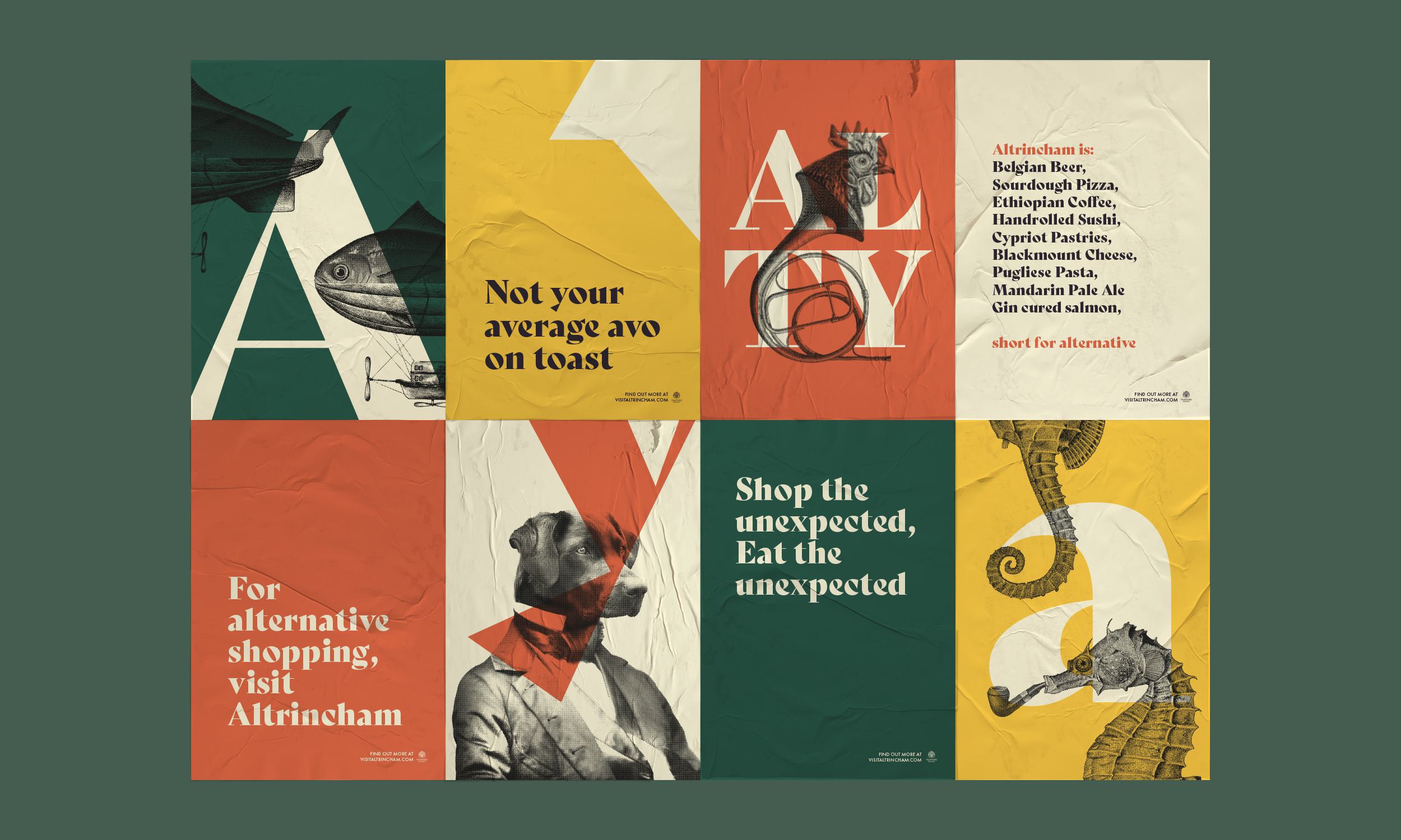I felt Altrincham needed a visual identity to support its recent growth. The success of the market area acted as a catalyst to further regenerate the town, emphasising the unexpected and the idea of being different, reflecting its demographic. The quirky mishmash of graphics were used to showcase the deviation from mainstream and the norm, which shines a light on all the quirky independents in the town. The campaign aimed to bring Altrincham alive in a way that is not just a regurgitation but a contemporary interpretation.