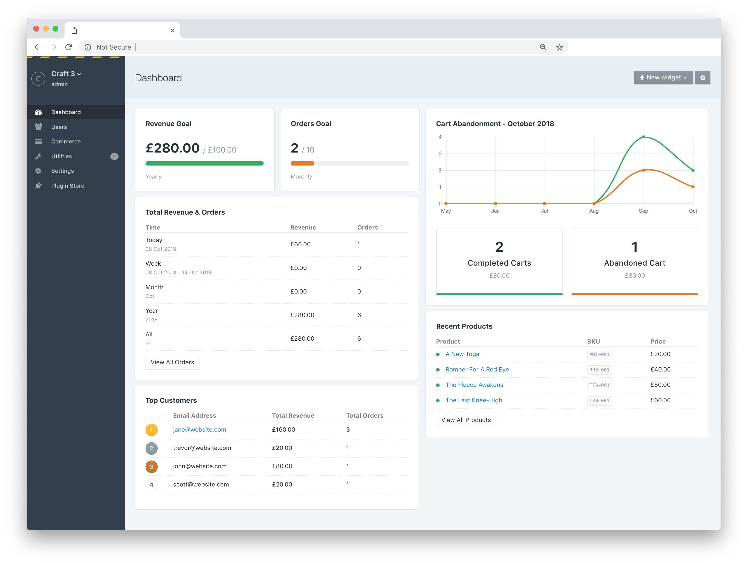 This plugin is a bundle of different widgets to choose from and include on Crafts dashboard. To name a few widgets included, you have access to a range-specific revenue chart, top product listings, cart abandonment statistics and customisable periodic goals.